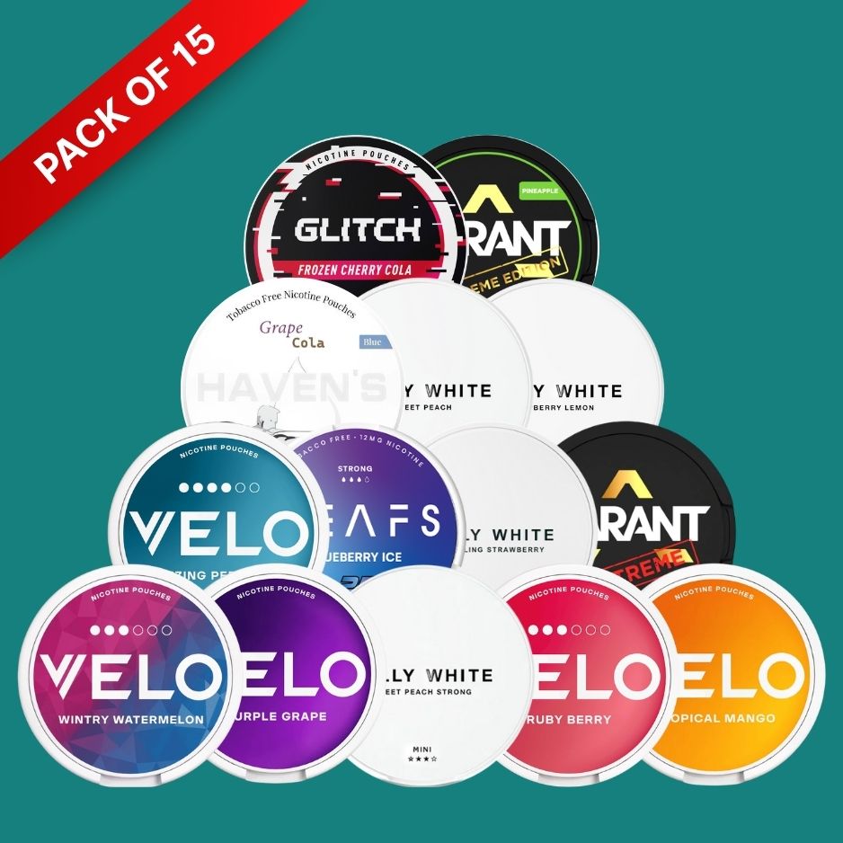 The Premium Freeze & Fruit Pack of 15 blends frosty mint coolness with vibrant fruity sweetness for the ultimate nicotine pouch experience. Designed for flavour seekers across the UK, this pack from VELO, Kelly White, Garant, GLITCH, HAVEN'S, and NEAFS offers smooth intensity and bold satisfaction.